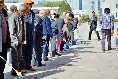 近日,定襄縣委老干局和縣老年書畫研究會組織該縣50余名書法愛好者在金鼎文化廣場開展了以“匯聚正能量、展示新精神”為主題的社會主義核心價值觀地書活動?;顒又荚诔珜Ш秃霌P社會主義核心價值觀基本內(nèi)容和普及推廣“地書“文化。(張玉虎 攝)