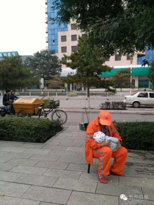 (五)創(chuàng)衛(wèi)工作如火如荼,環(huán)衛(wèi)女工扔下嗷嗷待哺的女兒投身在創(chuàng)衛(wèi)工作。環(huán)衛(wèi)女工正在清掃路面垃圾,母親帶孩子來(lái)找她喂奶,孩子吃飽后,又把孩子交給母親,邊鏟除口香糖,邊望著遠(yuǎn)去的親人,滿臉的依依不舍。(董蘊(yùn)宜 攝)