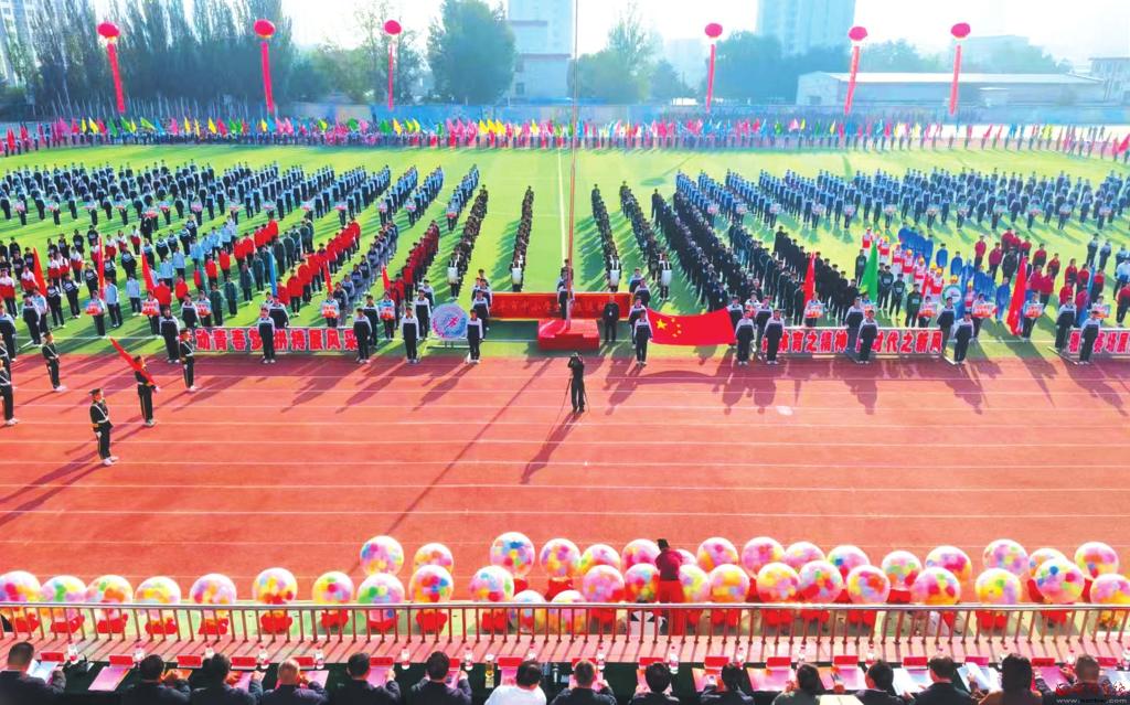 9月28日,原平市范亭中學(xué)校運(yùn)動(dòng)場(chǎng)上彩旗招展、鼓樂(lè)喧天,該市中小學(xué)秋季田徑運(yùn)動(dòng)會(huì)開幕,有小學(xué)、初中、高中的38支代表隊(duì)共3000余人參加了開幕式。圖為開幕式現(xiàn)場(chǎng)。(吉建平攝)