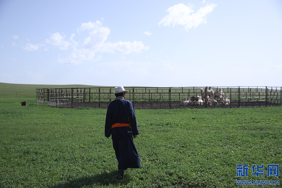 8月2日,其日麥拉圖在自家草場查看駱駝的喂養(yǎng)情況。新華網(wǎng)記者 焦鵬攝
