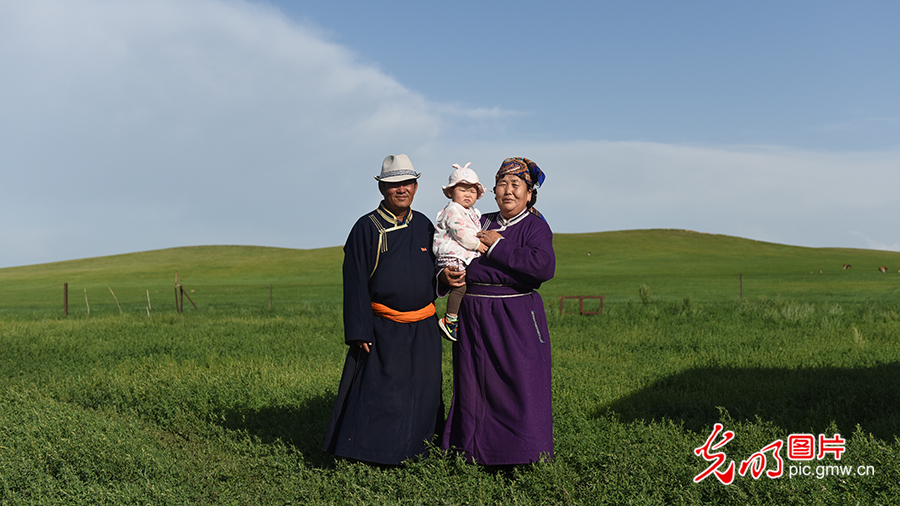 經(jīng)過(guò)60年的洗禮,當(dāng)年的上海孤兒已經(jīng)和這片草原完美的融為了一起?,F(xiàn)在的其日麥拉圖,家門(mén)口停著汽車(chē),牛舍里裝著監(jiān)控,五畜齊全,人丁興旺,真正過(guò)上了好日子。圖為2020年8月2日,其日麥拉圖夫婦和小孫女在自家牧場(chǎng)。(潘迪攝/光明圖片) (責(zé)任編輯:盧相汀) | ||||