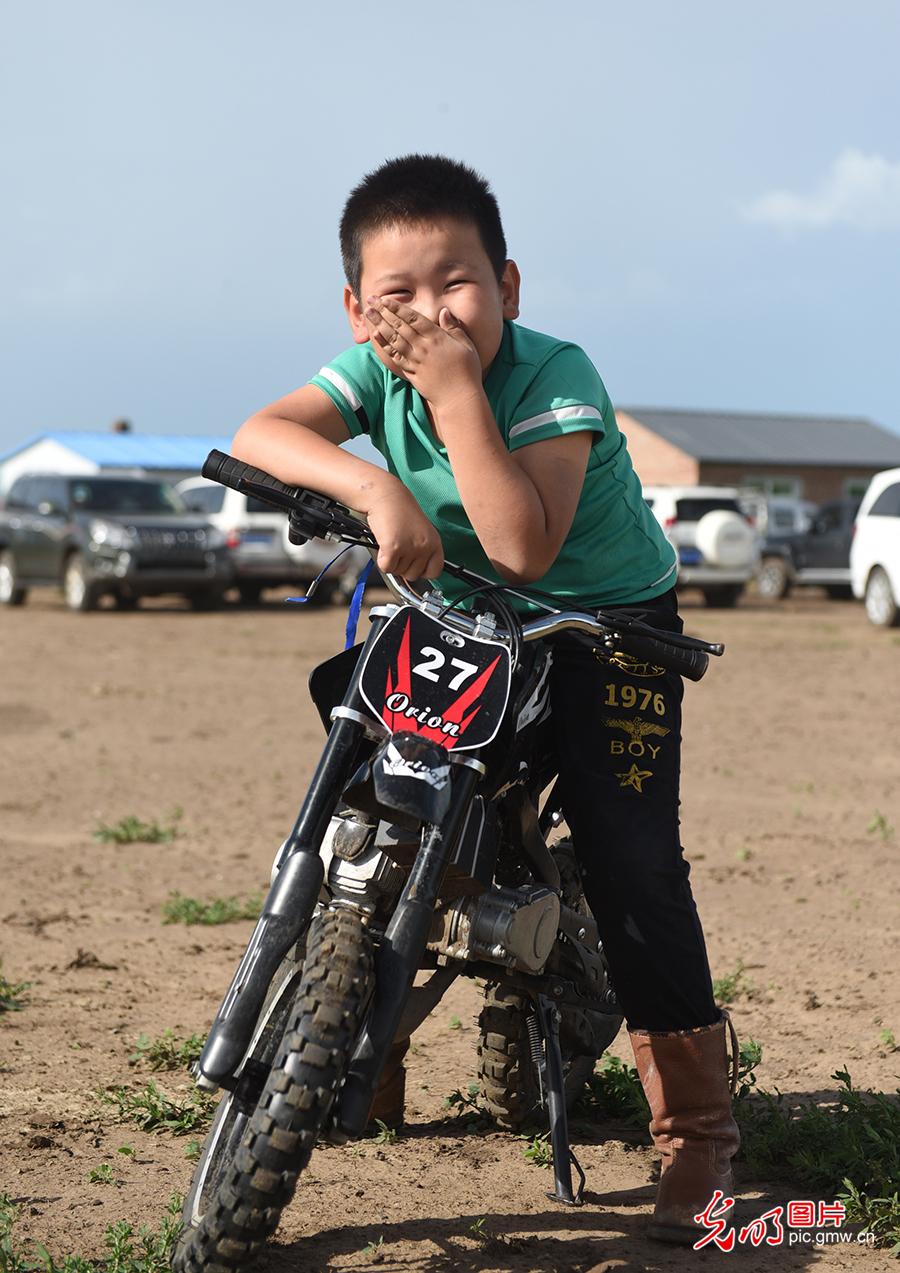 其日麥拉圖的大孫子時(shí)常會(huì)來(lái)爺爺家。對(duì)他而言,胯下的兒童玩具車(chē)就是他的“駿馬”,爺爺家的牧場(chǎng)就是他的后花園。圖為2020年8月2日,其日麥拉圖的孫子在牧場(chǎng)玩耍。(潘迪攝/光明圖片)