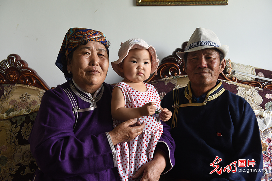 除了偶爾參加旗里的黨員活動(dòng),其日麥拉圖和老伴每日的生活就是含飴弄孫、養(yǎng)牛養(yǎng)馬,日子過(guò)得愜意又自在。圖為2020年8月2日,其日麥拉圖夫婦和小孫女在自家客廳合影留念。(潘迪攝/光明圖片)