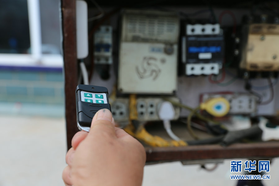 大棚里的噴灌設(shè)施可以通過遙控器控制,這是劉振義自己設(shè)計(jì)制作的“神器”。每天夜里,木耳大棚要澆兩次水,有了這個(gè)遙控器就不用再出門開關(guān)噴灌器了。新華網(wǎng)曹楨攝