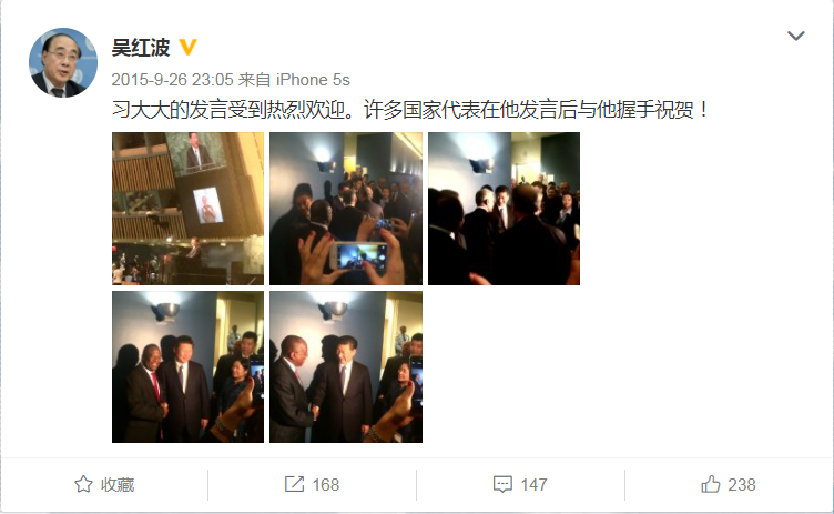 時任聯合國副秘書長吳紅波說,習主席走下講臺時,二三十位其他國家領導人排隊與他握手表示祝賀,走廊里擠得滿滿當當。