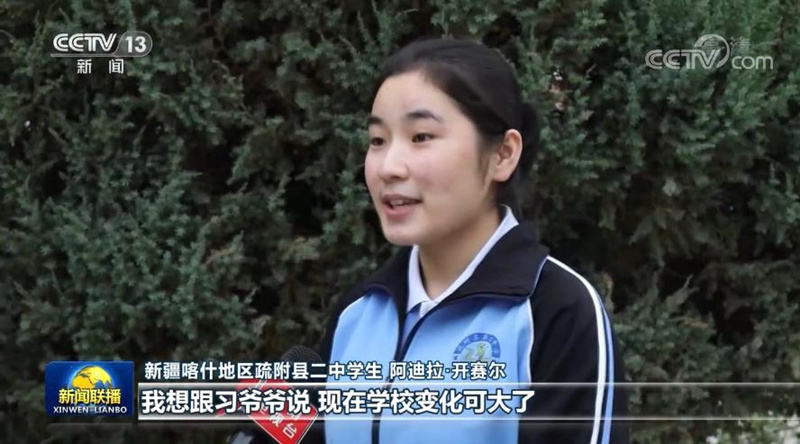 從設施到扶貧,從醫(yī)療到教育,發(fā)生在新疆的變化各族人民感同身受。疏附縣二中學生阿迪拉告訴記者,2014年4月,習近平總書記來學??赐麕熒€跟大家合了影。站在總書記右手邊的就是阿迪拉,現在她已經是一名高中生了。