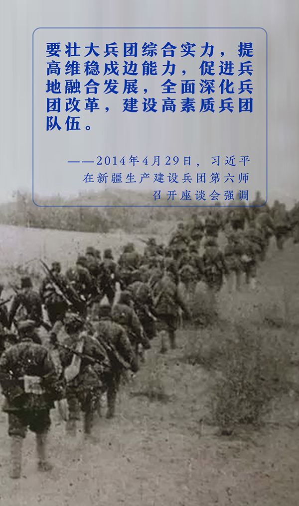 肩負(fù)著屯墾戍邊、造福一方的光榮使命,新疆生產(chǎn)建設(shè)兵團(tuán)成立60多年來(lái),逐漸形成了兵團(tuán)精神。進(jìn)入新時(shí)代,兵團(tuán)精神引領(lǐng)著越來(lái)越多的人挺進(jìn)沙漠邊緣和邊境沿線,為新疆經(jīng)濟(jì)社會(huì)發(fā)展、各民族團(tuán)結(jié)共進(jìn)作出了特殊貢獻(xiàn)。