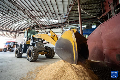 7月24日,在常德市鼎城區(qū)雙橋坪鎮(zhèn)一個水稻烘干工廠,工人駕駛鏟車把稻谷放入烘干設備。(新華社記者 周勉 攝)