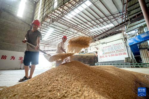 7月24日,在常德市鼎城區(qū)雙橋坪鎮(zhèn)一個水稻烘干工廠,工人把稻谷放入烘干設備。(新華社記者 周勉 攝)
