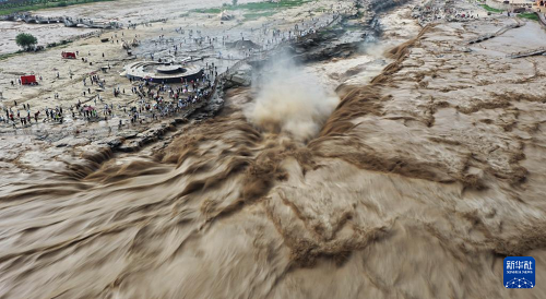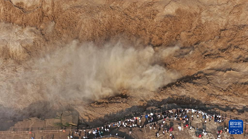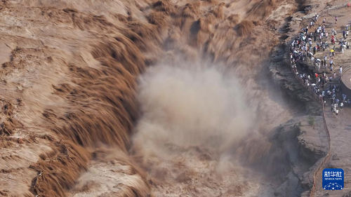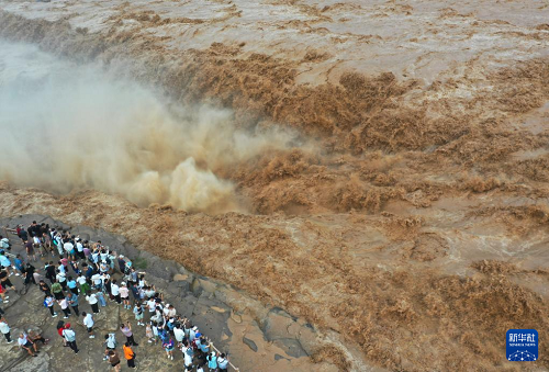 7月27日,人們?cè)谏轿骷h觀看黃河壺口瀑布(無(wú)人機(jī)照片)。(新華社發(fā) 呂桂明 攝)