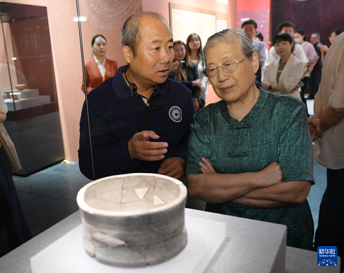 7月28日,著名考古學家、中國社會科學院考古研究所研究員安家瑤(右)在雄安新區(qū)聯(lián)合考古隊領(lǐng)隊何歲利的陪同下參觀展覽。(新華社記者 李賀 攝)