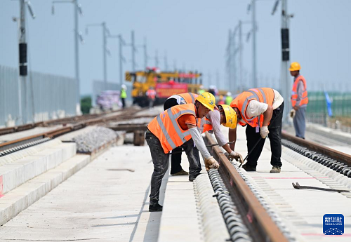 8月6日,中鐵一局施工人員在淮宿蚌城際鐵路鋪軌施工現(xiàn)場作業(yè)。(新華社記者 周牧 攝)