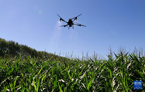 8月7日,在北大荒集團(tuán)黑龍江格球山農(nóng)場(chǎng)有限公司第二管理區(qū),一架植保無(wú)人機(jī)為玉米噴施“營(yíng)養(yǎng)液”。(新華社發(fā) 陸文祥 攝)