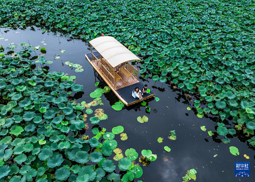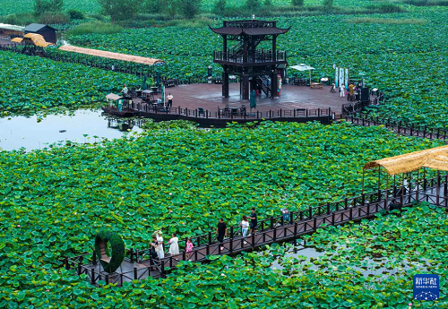 8月13日,游客在江蘇省興化市萬畝荷塘景區(qū)賞荷游玩(無人機(jī)照片)。(新華社發(fā) 周社根 攝)