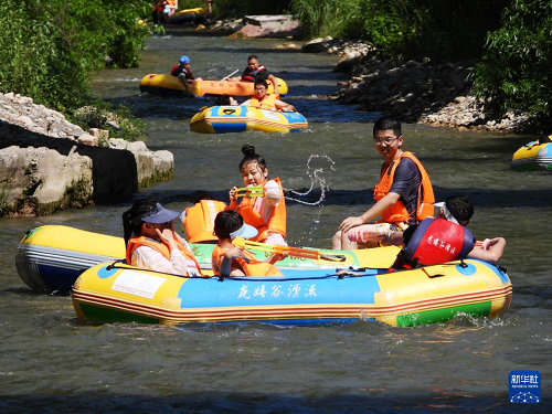 8月13日,游客在四川省達(dá)州市渠縣臨巴鎮(zhèn)涼橋村漂流游玩。(新華社發(fā) 鄧良奎 攝)