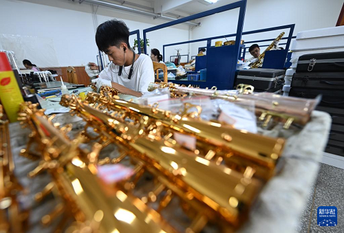 8月13日,在天津圣樂樂器有限公司,工作人員在生產(chǎn)車間裝配樂器。(新華社記者 趙子碩 攝)