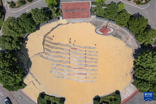 8月20日,人們在重慶市永川區(qū)紅爐鎮(zhèn)政府廣場上晾曬糧食(無人機照片)。(新華社記者 黃偉 攝)