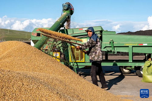 8月20日,呼倫貝爾農(nóng)墾拉布大林農(nóng)場(chǎng)的工人駕駛農(nóng)機(jī)將收獲的小麥裝車。(新華社記者 馬金瑞 攝)