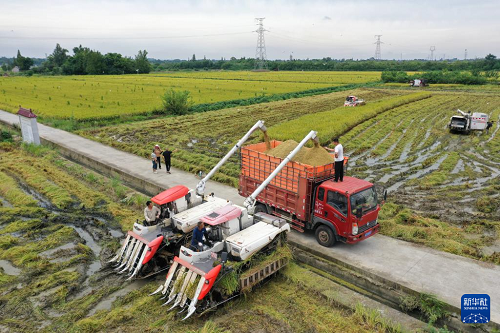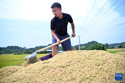 9月1日,在四川省內(nèi)江市東興區(qū)田家鎮(zhèn)趙家壩社區(qū),農(nóng)機(jī)手在水稻搶收現(xiàn)場(chǎng)裝車。(新華社發(fā) 李建明 攝)