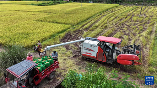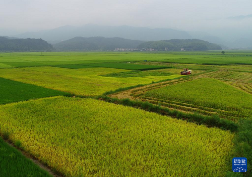 8月31日,在福建省南平市浦城縣仙陽(yáng)鎮(zhèn),村民駕駛收割機(jī)在田間作業(yè)(無(wú)人機(jī)照片)。(新華社發(fā) 黃杰敏 攝)