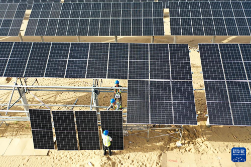 工人在庫布其沙漠里的杭錦旗朔方新能源大基地安裝光伏板(9月2日攝,無人機照片)。(新華社記者 李志鵬 攝)