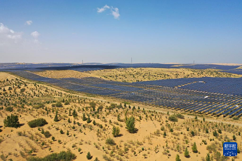 近年來,內(nèi)蒙古開展防沙治沙與風電光伏一體化工程,推進庫布其沙漠治理。目前,在鄂爾多斯市杭錦旗等庫布其沙漠北部地區(qū),一片片光伏基地在促進新能源產(chǎn)業(yè)發(fā)展的同時,成為當?shù)厣鷳B(tài)治理、經(jīng)濟發(fā)展的堅實屏障?!肮夥?生態(tài)治理”建設模式實現(xiàn)板上發(fā)電,板間、板下統(tǒng)籌兼顧特色生態(tài)修復、經(jīng)濟作物、造林綠化與技術(shù)創(chuàng)新,打造立體生態(tài)修復模式,讓沙海變成綠色電能涌動的“藍?!保瑢崿F(xiàn)生態(tài)效益與經(jīng)濟效益共贏。