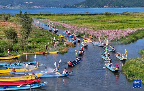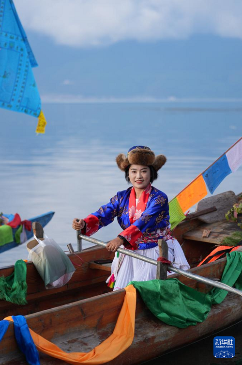 9月16日,當(dāng)?shù)厝罕婑{著豬槽船從瀘沽湖的洛洼北碼頭開始轉(zhuǎn)海(無人機(jī)照片)。(新華社記者 江宏景 攝)