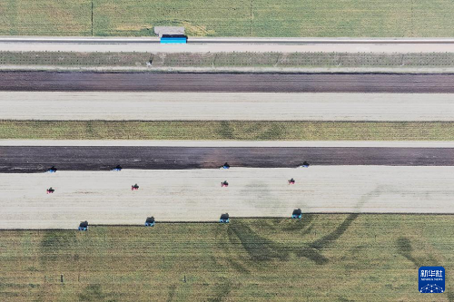 9月23日,在黑龍江北大荒農(nóng)業(yè)股份有限公司友誼分公司一旱田地塊,大型農(nóng)業(yè)機械在進行大豆收獲作業(yè)(無人機照片)。(新華社記者 王松 攝)