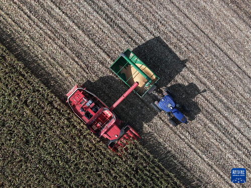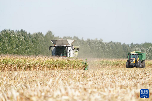 9月23日,在黑龍江北大荒農(nóng)業(yè)股份有限公司友誼分公司一旱田地塊,大型農(nóng)業(yè)機械在進行玉米收獲作業(yè)。(新華社記者 王松 攝)