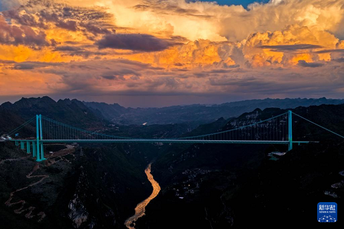 9月28日拍攝的夕陽下的貴州花江峽谷大橋(無人機(jī)照片)。(新華社記者 楊文斌 攝)