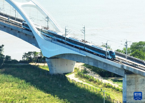 9月29日,列車通過(guò)福州濱海快線烏龍江大橋(無(wú)人機(jī)照片)。(新華社記者 林善傳 攝)