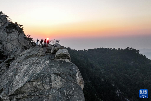10月9日清晨,幾名游客在龜峰山觀日出(無人機照片)。(新華社記者 陳曄華 攝)