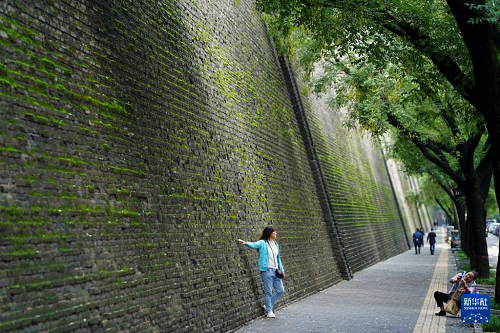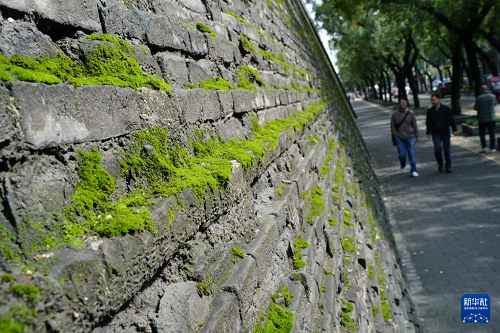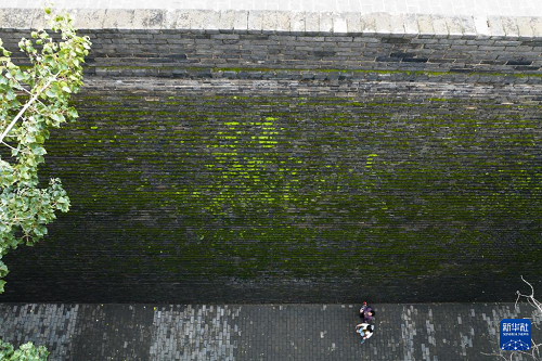 西安城墻始建于隋唐、擴建于明代,是中國現(xiàn)存歷史最悠久、保存最完整的古代城垣建筑。連綿秋雨過后,苔蘚等植物為西安城墻披上了一層綠色的外衣,吸引市民和游人駐足觀看、拍照。