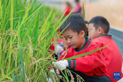 10月15日,云南省曲靖市陸良縣大莫古鎮(zhèn)中心幼兒園的孩子們在校內(nèi)勞動基地體驗打稻穗。(新華社發(fā) 王勇 攝)
