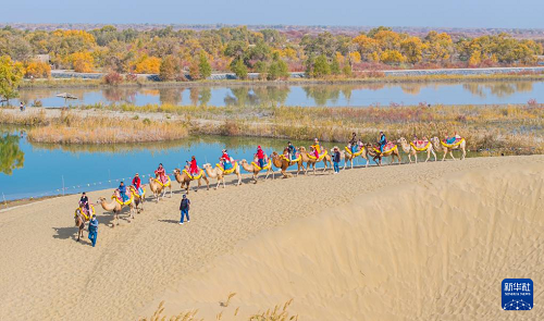 10月18日,游客在新疆巴音郭楞蒙古自治州尉犁縣羅布人村寨景區(qū)東沙山體驗駱駝騎行(無人機(jī)照片)。(新華社發(fā) 汪志鵬 攝)