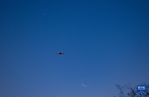 10月20日,在位于黑龍江省黑河市的北大荒集團(tuán)北安分公司趙光農(nóng)場(chǎng)有限公司,攝影愛(ài)好者在用無(wú)人機(jī)拍攝啟明星伴月。(新華社發(fā) 錢(qián)泊羽 攝)