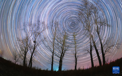 10月31日在黑龍江省富錦市拍攝的秋日星空下的秋樹(堆棧合成照片)。(新華社發(fā) 庚喜慶 攝)