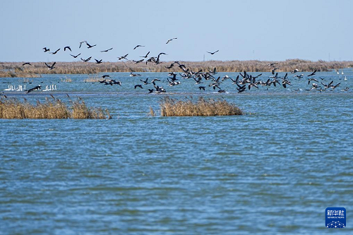 11月13日,在黃河三角洲國家級自然保護(hù)區(qū),越冬候鳥在飛翔。(新華社記者 朱崢 攝)