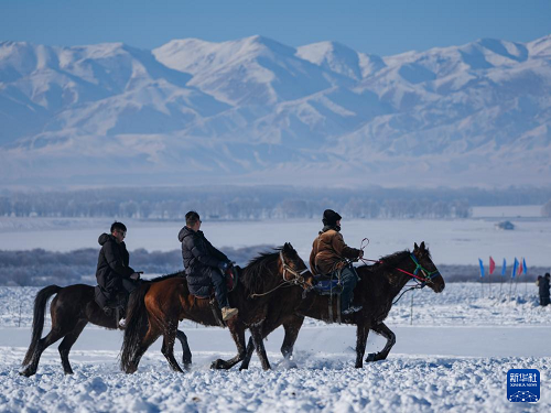 1月3日,在新疆昭蘇濕地公園,游客在當(dāng)?shù)啬撩瘢ㄓ遥ьI(lǐng)下體驗(yàn)雪地騎馬。(新華社記者 胡虎虎 攝)