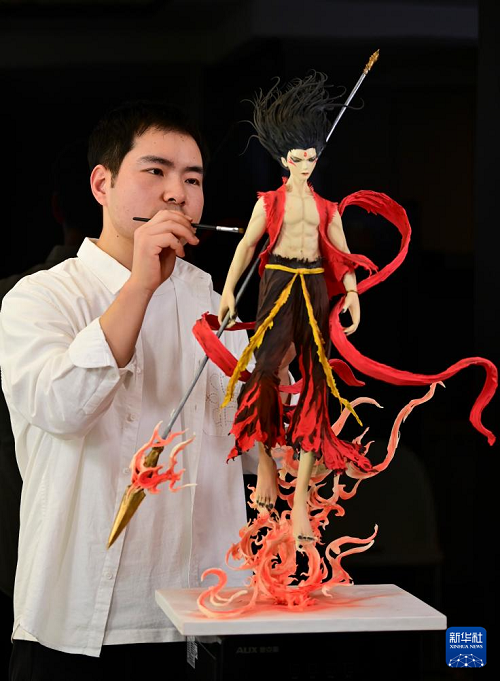 糖藝師張勃在為糖藝作品《哪吒》上色(1月13日攝)。(新華社記者 鄒競一 攝)