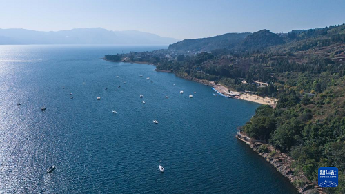 1月27日在云南省玉溪市拍攝的撫仙湖一景(無人機(jī)照片)。(新華社記者 高詠薇 攝)