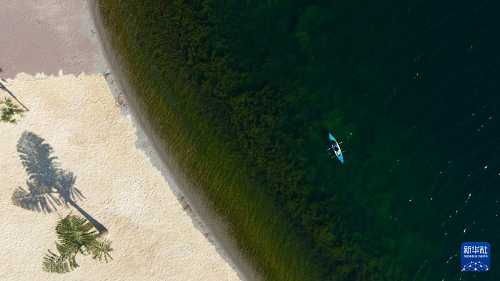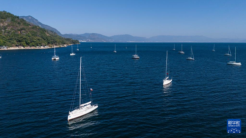 1月27日,游客在云南省玉溪市撫仙湖劃船游玩(無人機(jī)照片)。(新華社記者 高詠薇 攝)