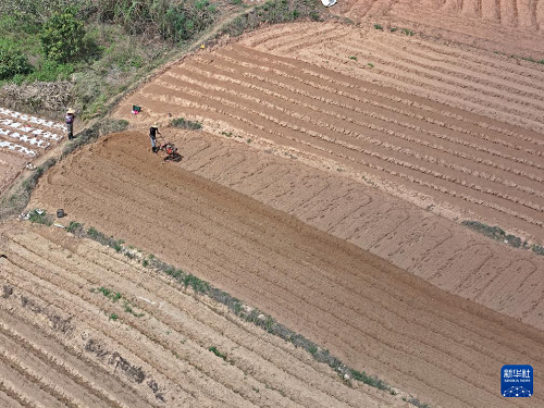3月1日,村民在廣西南寧市邕寧區(qū)蒲廟鎮(zhèn)田園里耕作(無人機照片)。(新華社記者 周華 攝)