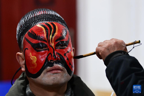 3月2日凌晨,老藝人為隴縣黃花峪村社火隊(duì)隊(duì)員繪制社火臉譜。(新華社記者 鄒競一 攝)