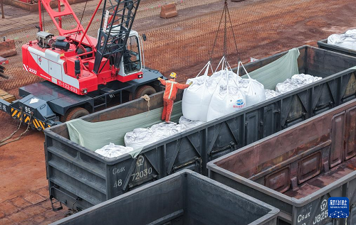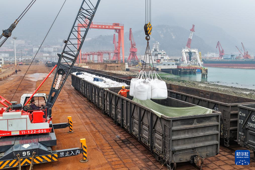 3月4日,工人在江蘇連云港港東方港務(wù)分公司碼頭鐵路裝車(chē)點(diǎn)將化肥裝上貨運(yùn)專列(無(wú)人機(jī)照片)。(新華社發(fā) 王健民 攝)