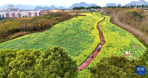 3月5日,游客在廣西來賓市忻城縣的油菜花田中游玩(無人機照片)。(新華社發(fā) 樊紹光 攝)