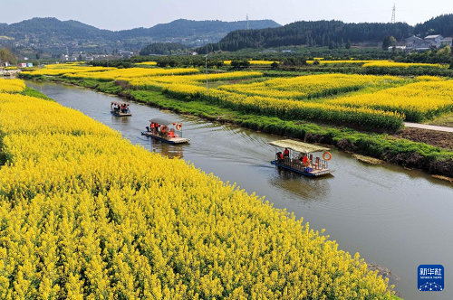 3月5日,游客在四川省南充市蓬安縣正源鎮(zhèn)石牛村乘坐游船賞花游玩(無人機照片)。(新華社發(fā) 劉永紅 攝)