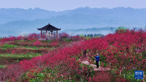 3月5日,游客在四川省瀘州市納溪區(qū)上馬鎮(zhèn)的桃林里賞花游玩(無人機照片)。(新華社發(fā) 廖勝春 攝)