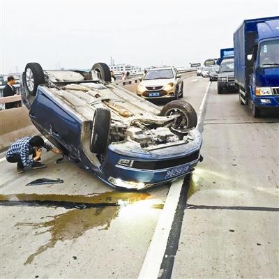 事故現(xiàn)場一輛藍色轎車被撞翻