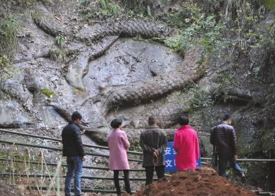 石龍雕刻位于石龍村的石龍溝,在山溝里的一處半山腰上。昨天下午,記者趕到現(xiàn)場時,多名當(dāng)?shù)厝苏谑埾路蕉哑鍪^,準(zhǔn)備做成堡坎,防止石龍周圍再被泥土及滑坡掩埋。